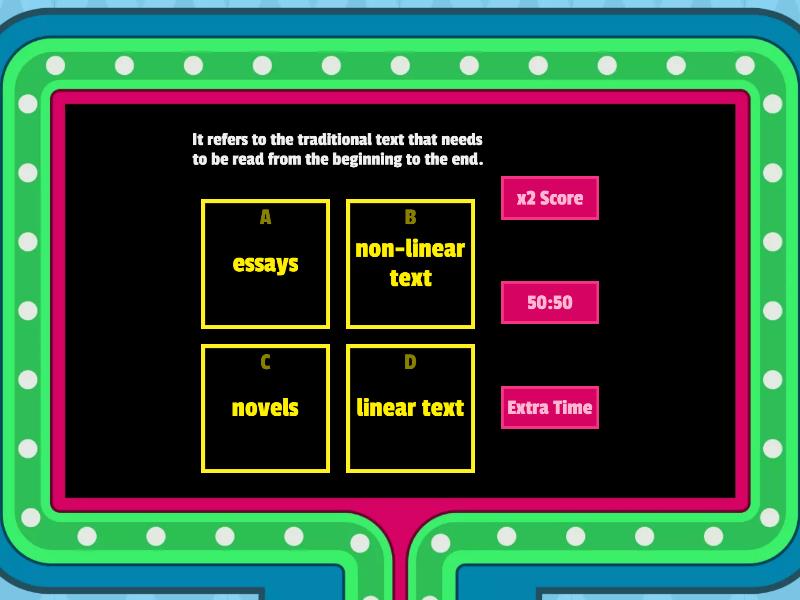 1) It refers to the traditional text that needs to be read from the beginning to the end. a) essays b) non-linear text c) novels d) linear text 2) It is a type of graph (= a mathematical picture) in which different amounts are represented by thin vertical or horizontal rectangles that have the same width but different heights or lengths: a) bar graph b) flow chart c) line graph d) pictograph 3) This type of text has many reading paths since it’s the readers who decide the sequence of reading, not the author of the text. a) linear text b) short story c) non-linear text d) poems 4) It is a type of graph that displays data in a circular graph. a) bar graph b) pie graph c) line graph d) timeline 5) All are examples of linear text EXCEPT.. a) essay b) novel c) poems d) concept map 6) It is a process involving the literal substitution of source language by the corresponding target language. a) encoding b) decoding c) transcoding d) reporting 7) It is a picture of the separate steps of a process in sequential order. a) line graph b) bar graph c) histogram d) flow chart 8) All are examples of non-linear text except... a) venn diagram b) newspaper report c) timeline d) timeline 9) It is one of the simplest ways of representing data. a) concept map b) bar graph c) pictograph d) flow chart 10) Transcoding linear and non-linear text is an essential skill for readers to develop. a) YES b) NO c) MAYBE d) ALL OF THE ABOVE