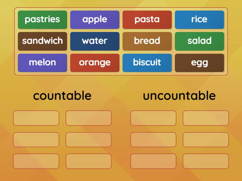 countable: apple, melon, orange, egg, biscuit, sandwich, uncountable: salad, pasta, rice, water, bread, pastries,