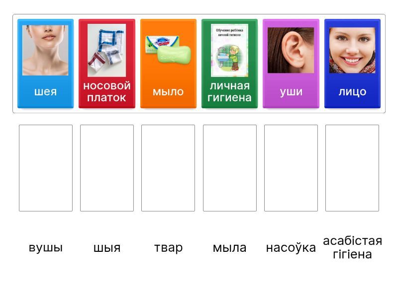 личная гигиена - асабiстая гiгiена, расчёска - грэбень, носовой платок - насоўка, полотенце - ручнік, мыло - мыла, грязный - брудны, одеваться - апранацца, уши - вушы, шея - шыя, глаза - вочы, лицо - твар, волосы - валасы,