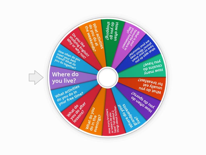 Where do you live?, Where do your grandparents live?, How many cousins do you have?, What do you do after lessons?, What activities do you do at the weekends?, What do you usually eat for breakfast?, What do you do in the evenings?, How often do you do sports?, What activities do you do in your free time?, Do you like studying English? Why or why not?, What is your favourite place in your hometown? Why?, What apps do you have on your smart phone? Which ones are your favourite?, How many brothers or sisters do you have? Tell about 2 things about him/her., How often do you go shopping?, How often do you meet your best friend? What do you do together?.