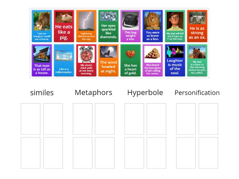 similes: He eats like a pig., Her eyes sparkled like diamonds., You were as brave as a lion., He is as strong as an ox., Metaphors: Laughter is music of the soul., Life is a rollercoaster., My dad is a bear in the morning before he gets his coffee., She has a heart of gold., Hyperbole: This bag weighs a ton., That man is as tall as a house., My dad will kill me if I get an F on the test., I am so hungry I could eat a horse., Personification: Lightning danced across the sky., The wind howled at night., Rita heard the last piece of pie calling her name., My alarm clock yells at me every morning.,