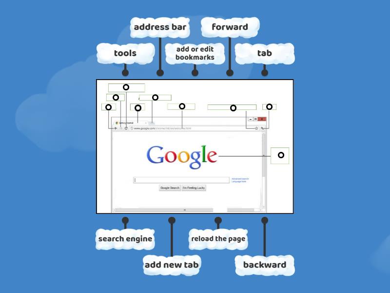 backward, forward, reload the page, tab, add new tab, address bar, add or edit bookmarks, tools, search engine.