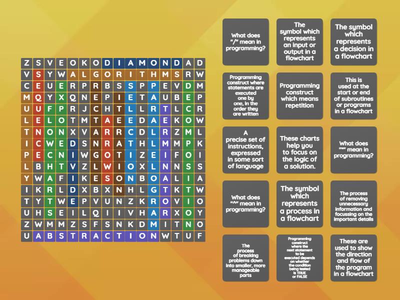 flowcharts - These charts help you to focus on the logic of a solution., terminator - This is used at the start or end of subroutines or programs in a flowchart, arrows - These are used to show the direction and flow of the program in a flowchart, parallelogram - The symbol which represents an input or output in a flowchart , rectangle - The symbol which represents a process in a flowchart, diamond - The symbol which represents a decision in a flowchart, algorithms - A precise set of instructions, expressed in some sort of language, decomposition - The process of breaking problems down into smaller, more manageable parts, abstraction - The process of removing unnecessary information and focussing on the important details, sequence - Programming construct where statements are executed one by one, in the order they are written, selection - Programming construct where the next statement to be executed depends on whether the condition being tested is TRUE or FALSE, iteration - Programming construct which means repetition, divide - What does "/" mean in programming?, multiply - What does "*" mean in programming?, exponent - What does "^" mean in programming?,
