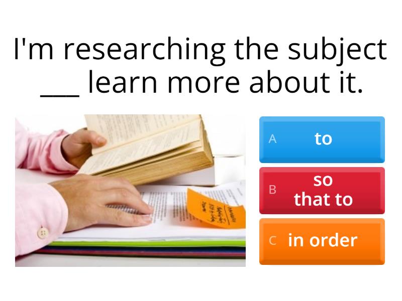 1) I'm researching the subject ___ learn more about it. a) to b) so that to c) in order 2) I turned off the TV _______. a) in order I could concentrate b) so that I could concentrate c) for concentrating 3) I ran ______ be late. a) in order not to b) in order to not c) so not as 4) I''ve got a big bowl ________ salads. a) in order to make b) for making c) so that I make 5) I'm going to the shops _______ some milk. a) to buy b) for buying c) so that I buy 6) He's going to bed early _______ tired tomorrow. a) to not be b) in order not be c) so that he isn't 7) I turned to music down, ________ bother the neighbours. a) so that not to b) so as not to c) not to 8) There's a world of information out there, but I mostly use the internet _________ cat videos. a) for watching b) so that I watch c) so as to watch 9) Put the lid back on that water, _____________ you don't spill it. a) in order b) so as c) so that 10) _________ the event, you first need to buy a ticket. a) In order to attend b) For attending c) So that to attend