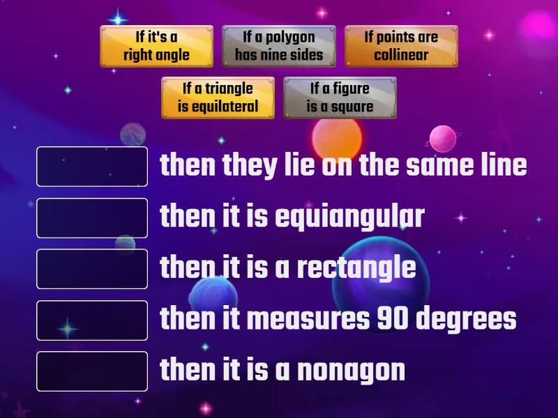 If a figure is a square - then it is a rectangle, If a polygon has nine sides - then it is a nonagon, If points are collinear - then they lie on the same line, If a triangle is equilateral - then it is equiangular, If it's a right angle - then it measures 90 degrees,