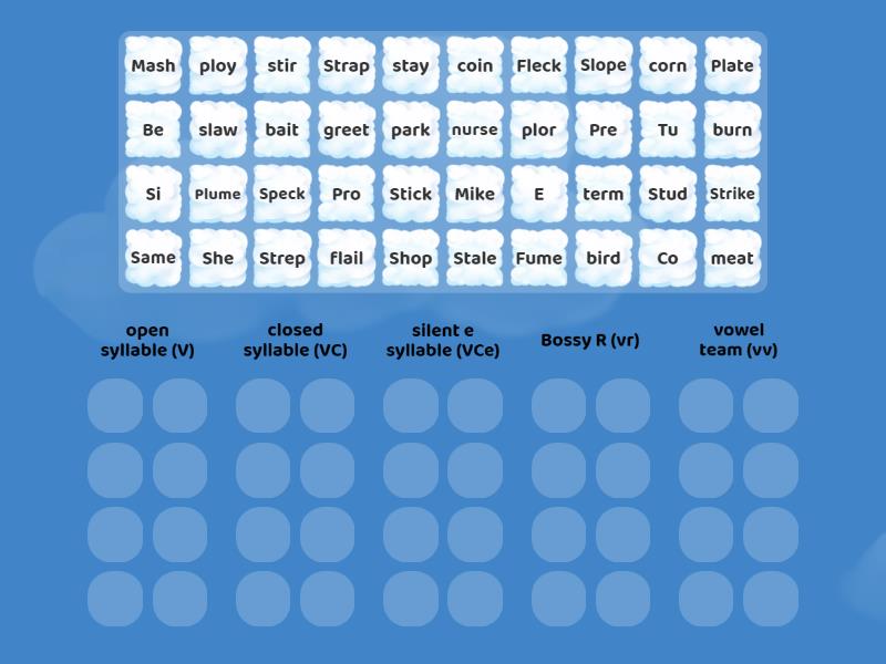 open syllable (V): Pre, Be, Co, Si , Pro, She, E, Tu , closed syllable (VC): Strep, Strap, Fleck , Speck, Stick, Shop, Mash, Stud, silent e syllable (VCe): Stale, Mike, Same, Strike, Slope, Plate , Fume, Plume, Bossy R (vr): bird, stir, plor, corn, nurse, burn, park, term, vowel team (vv): ploy, slaw, coin, meat, greet, bait, flail, stay,
