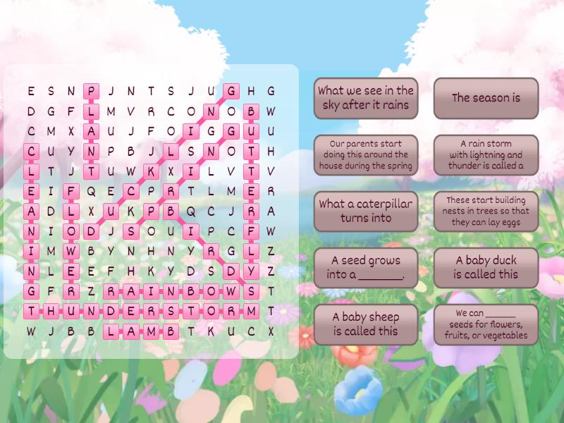 Spring - The season is , Plant - We can ______ seeds for flowers, fruits, or vegetables, Flower - A seed grows into a _______., Thunderstorm - A rain storm with lightning and thunder is called a , Duckling - A baby duck is called this, Lamb - A baby sheep is called this, Rainbow - What we see in the sky after it rains, Butterfly - What a caterpillar turns into, Birds - These start building nests in trees so that they can lay eggs, Cleaning - Our parents start doing this around the house during the spring,