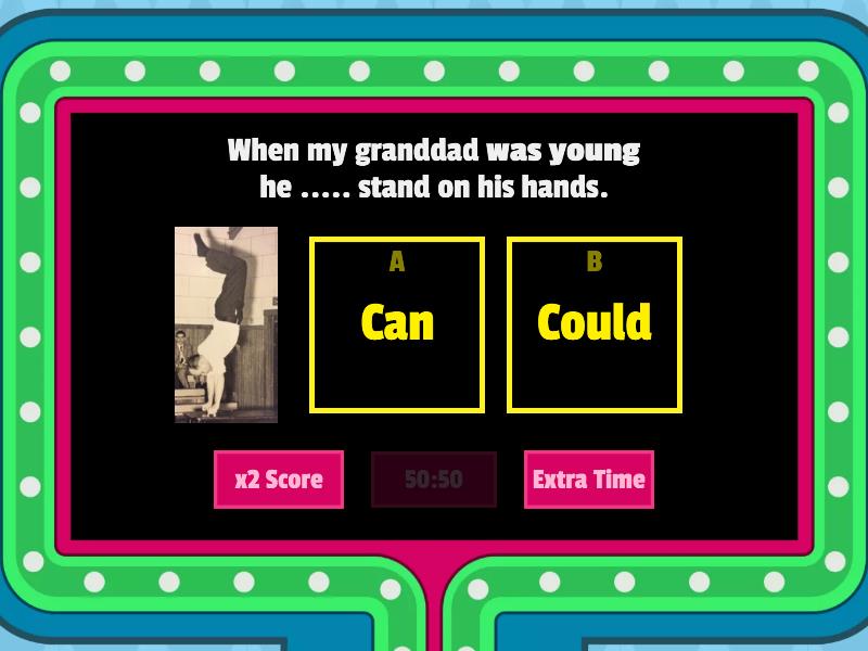 1) When my granddad was young he ..... stand on his hands. a) Can b) Could 2) Now that I am ten years old, I .... ride my bike without trainer wheels. a) can b) could 3) Birds .... fly. a) can b) can't 4) When my cat was born, he ...... run. a) can't b) couldn't 5) Because I'm not an adult, I .... drive a car. a) can't b) couldn't c) could 6) Anna __________ do sommersaults when she was a child. a) can't b) could c) can 7) Peter learned rugby at school, now he ... play professionally. a) couldn't b) can c) could 8) Roxane is an athlete but she .... win the tournament last week. a) couldn't b) can c) can't 9) Now my brother ..... jump the rope in one foot. a) can b) could c) couldn't 10) Melissa's dog .... catch the ball when were at the park yesterday. a) can b) can't c) could