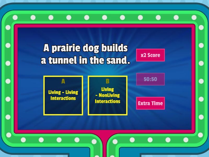 1) A prairie dog builds a tunnel in the sand. a) Living - Living Interactions b) Living - NonLiving Interactions 2) The prairie dog gives a warning call so others can hide when a hawk flies by. a) Living - Living Interactions b) Living - NonLiving Interactions 3) A plant takes in water from the rain. a) Living - Living Interactions b) Living - NonLiving Interactions 4) The fish swims in a school to confuse predators. a) Living - Living Interactions b) Living - NonLiving Interactions 5) The anole lizard rested on one of the rocks and lifted its head toward the light. a) Living - Living Interactions b) Living - NonLiving Interactions 6) A honeybee collects pollen from flower to flower. a) Living - Living Interactions b) Living - NonLiving Interactions 7) The fish opens its mouth and uses its gills to get oxygen from the water. a) Living - Living Interactions b) Living - NonLiving Interactions 8) The prairie dog burrows a new tunnel in the soil. a) Living - Living Interactions b) Living - NonLiving Interactions 9) The tadpole nibbles on the algae growing on a log. a) Living - Living Interactions b) Living - NonLiving Interactions 10) A bird hunts for insects and spiders to feed its chicks. a) Living - Living Interactions b) Living - NonLiving Interactions 11) The anole lizard climbed the plant and then ate a cricket off one of the leaves. a) Living - Living Interactions b) Living - NonLiving Interactions 12) A hippo floats in the water. a) Living - Living Interactions b) Living - NonLiving Interactions 13) A honeybee flies across a field of flowers a) Living - Living Interactions b) Living - NonLiving Interactions 14) A bird drinking and taking a bath in a puddle of water. a) Living - Living Interactions b) Living - NonLiving Interactions