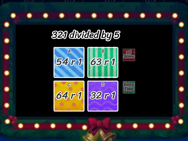 1) 87 x 7 a) 609 b) 543 c) 212 d) 613 2) 435 x 9 a) 3,213 b) 3,915 c) 4,098 d) 321 3) 44 divided by 4 a) 16 b) 12 c) 32 d) 11 4) 45 divided by 7 a) 6 r 3 b) 7 r2 c) 5r 4 d) 9 r 3 5) 321 divided by 5 a) 54 r 1 b) 63 r 1 c) 64 r 1 d) 32 r 1 6) Which word below tells you in a word problem to divide? a) total of b) each c) how many d) related to 7) There are 7 swimmers on each relay team. If a total of 56 swimmers signed up, how many relay teams are there? a) 6 relay teams b) 8 relay teams c) 9 relay teams d) 11 relay teams 8) After reading a word problem, what is the first step to begin solving? a) Underline the question b) Circle key words c) Underline important information d) Circle key numbers 9) What key word below tells you to divide? a) Equal b) Divided equally c) Times d) How many 10) Six students divided 42 base-ten rods equally among them. How many base-ten rods would each student get? a) 7 base-ten rods b) 6 base-ten rods c) 4 base-ten rods d) 12 base-ten rods 11) There are 4 dogs needed on each sled team. If a total of 64 dogs are signed up, how many sled teams could there be? a) There could be 6 sled teams. b) 16 dogs c) There could be 16 sled teams. d) There are not enough dogs. 12) What does equal amount of tell you to do in math? a) Multiply b) Add c) Subtract d) Divide 13) Miranda has 3,300 stickers in her collection. She puts an equal amount of stickers into 5 books. How many stickers will be in each book? a) There will be 540 stickers. b) There will be 660 stickers in each book. c) There will be 432 stickers. d) There will be 660 books of stickers. 14) 675 x 4 a) 2,300 b) 2,700 c) 3,200 d) 3,120 15) 2,345 x 6 a) 12,409 b) 14,560 c) 14,070 d) 15,321 16) 675 divided by 5 a) 123 b) 145 c) 132 d) 135 17) 378 divided by 9 a) 18 b) 32 c) 14 d) 17 18) What does the acronym DMSB stand for in math? a) Does McDonald's Sell Burgers? b) Does Mickey Mouse Sell Candy? c) Divide Multiply Subtract Bring Down d) Division Multiplication Silly Bugs 19) 876 divided by 4 a) 200 b) 220 c) 321 d) 219 20) 543 x 12 a) 6,516 b) 3,343 c) 6,512 d) 9,324