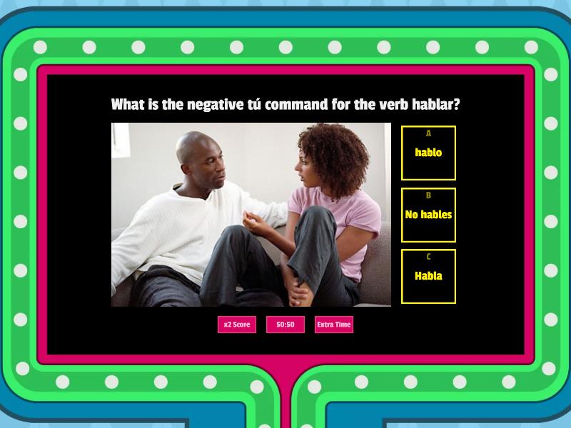 1) What is the negative tú command for the verb hablar? a) hablo b) No hables c) Habla 2) What is the negative tú command for the verb comer? a) No comas b) come c) como 3) What is the negative tú command for the verb escribir? a) escriban b) No escribas c) No escriba 4) What is the negative tú command for the verb tener? a) No tengas b) Teno c) tienen 5) What is the negative tú command for the verb decir? a) Digo b) Deco c) No digas