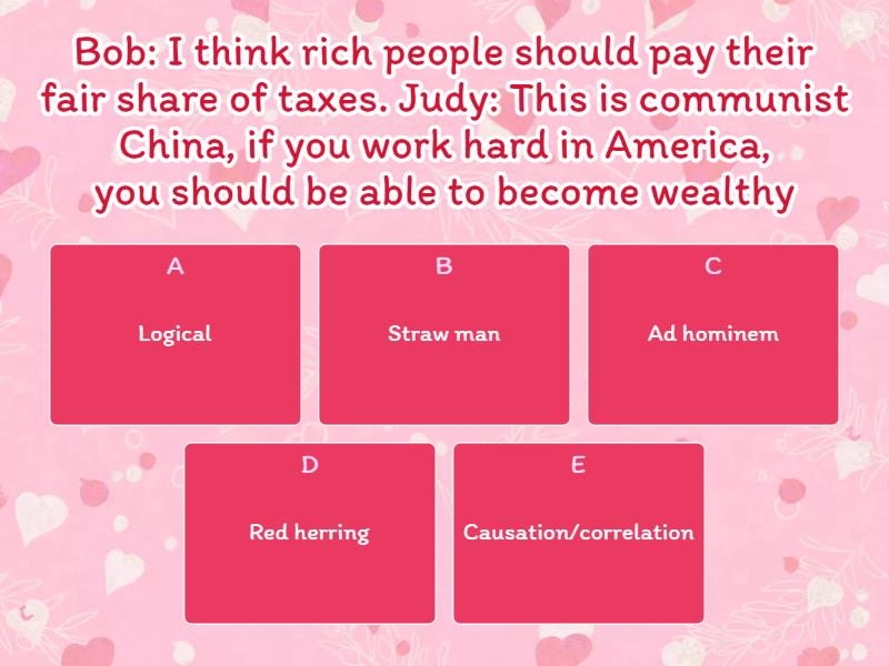 1) Man: "I don't think it's fair for me to pay for everything since you also have a job." Woman: "Men are trash." a) Logical b) Straw man c) Ad hominem d) Red herring e) Causation/correlation 2) The less water people drink, the more likely they are to have headaches. People should drink more water to help prevent headaches. a) Logical b) Straw man c) Ad hominem d) Red herring e) Causation/correlation 3) Women who go to bars are more likely to get sexually assaulted. Women should stop going to bars to avoid sexual assault. a) Logical b) Straw man c) Ad hominem d) Red herring e) Causation/correlation 4) "Poor people wanted help with rent and food during the pandemic." "I don't think it's right for the government to give everyone everything for free." a) Logical b) Straw man c) Ad hominem d) Red herring e) Causation/correlation 5) Miss America contestants should not be older than 18 so that we can save lives. a) Logical b) Straw man c) Ad hominem d) Red herring e) Causation/correlation 6) Trump supporters: We want lower taxes. Liberals: LOL look at that MAGA hat wearing racist loser. a) Logical b) Straw man c) Ad hominem d) Red herring e) Causation/correlation 7) Imagine the children drowning in pools! Ban nuclear power plants now! a) Logical b) Straw man c) Ad hominem d) Red herring e) Causation/correlation 8) Teacher: "I noticed you're struggling on this assignment, why don't you come to tutoring?" Student: "I can't do anything right in this class!" a) Logical b) Straw man c) Ad hominem d) Red herring e) Causation/correlation 9) Woman: "I want to have equal pay and laws that protect women in the workplace." Man: "Go make me a sandwich." a) Logical b) Straw man c) Ad hominem d) Red herring e) Causation/correlation 10) I know you want all school students to do debate, but have you thought about the benefits of reducing social media use? a) Logical b) Straw man c) Ad hominem d) Red herring e) Causation/correlation 11) "I don't think recycling is going to solve climate change." "Oh so we should just do nothing and let the planet burn?" a) Logical b) Straw man c) Ad hominem d) Red herring e) Causation/correlation 12) "I don't think it's fair to let trans women compete in women's sports because they kind of have an advantage." "So you don't believe in any gay rights??" a) Logical b) Straw man c) Ad hominem d) Red herring e) Causation/correlation 13) Journalist: Mr. Trump, would you legalize marijuana? Trump: Nobody knows marijuana better than me. They say "sir, no one has better knowledge than you." It's unbelievable. I'm knowledgeable bigly about all things. Some say I'm a genius." a) Logical b) Straw man c) Ad hominem d) Red herring e) Causation/correlation 14) The shorter the words, the better for our safety. a) Logical b) Straw man c) Ad hominem d) Red herring e) Causation/correlation 15) Parent: Please be home by 11pm tonight, it's going to snow and the roads will be dangerous. Kid: But you stayed out later than that when you were a teen!  a) Logical b) Straw man c) Ad hominem d) Red herring e) Causation/correlation 16) The more educated you are, the more likely you are to make more money. a) Logical b) Straw man c) Ad hominem  d) Red herring e) Causation/correlation  17) Trump wants to cut taxes. The man can't even get a single sentence out right, and he wants me to trust him with my taxes? a) Logical b) Straw man c) Ad hominem d) Red herring e) Causation/correlation 18) Women: Domestic violence is a huge problem that hurts women. Men: You know men get beaten up, too.  a) Logical b) Straw man c) Ad hominem d) Red herring e) Causation/correlation 19) Bob: I think rich people should pay their fair share of taxes. Judy: This is communist China, if you work hard in America, you should be able to become wealthy a) Logical b) Straw man c) Ad hominem d) Red herring e) Causation/correlation