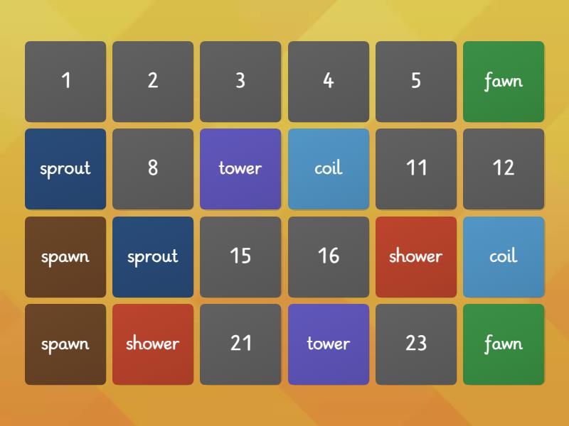 fawn, tower, shower, coil, spawn, sprout, cloud, shook, auto, launch, coin, spew,