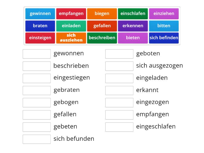 sich ausziehen - sich ausgezogen, sich befinden - sich befunden, beschreiben - beschrieben, biegen - gebogen, bieten - geboten, bitten - gebeten, braten - gebraten, einladen - eingeladen, einschlafen - eingeschlafen, einsteigen - eingestiegen, einziehen - eingezogen, empfangen - empfangen, erkennen - erkannt, gefallen - gefallen, gewinnen - gewonnen,