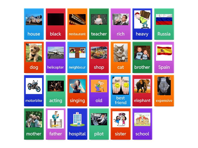 father, school, house, sister, Russia, teacher, neighbour, old, Spain, mother, rich, shop, best friend, motorbike, helicopter, elephant, pilot, dog, brother, acting, restaurant, cat, expensive, heavy, hospital, singing, black,