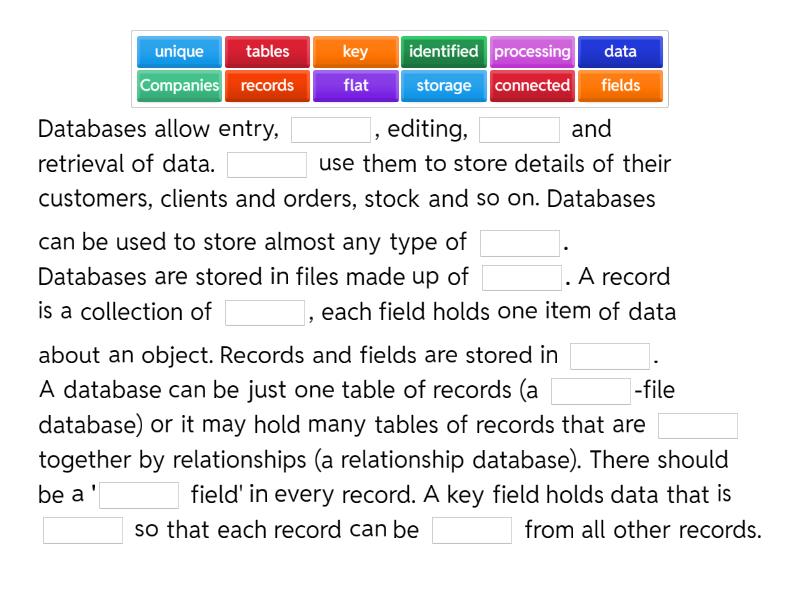 Databases allow entry, ____, editing, ____ and retrieval of data. ____ use them to store details of their customers, clients and orders, stock and so on. Databases can be used to store almost any type of ____. Databases are stored in files made up of ____. A record is a collection of ____, each field holds one item of data about an object. Records and fields are stored in ____. A database can be just one table of records (a ____-file database) or it may hold many tables of records that are ____ together by relationships (a relationship database). There should be a '____ field' in every record. A key field holds data that is ____ so that each record can be ____ from all other records.