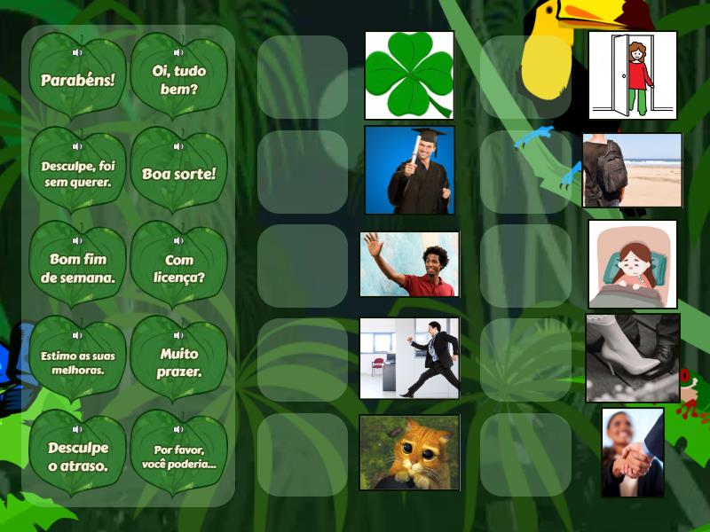 Muito prazer., Estimo as suas melhoras., Parabéns!, Desculpe, foi sem querer., Desculpe o atraso., Boa sorte!, Por favor, você poderia..., Com licença?, Bom fim de semana., Oi, tudo bem?,