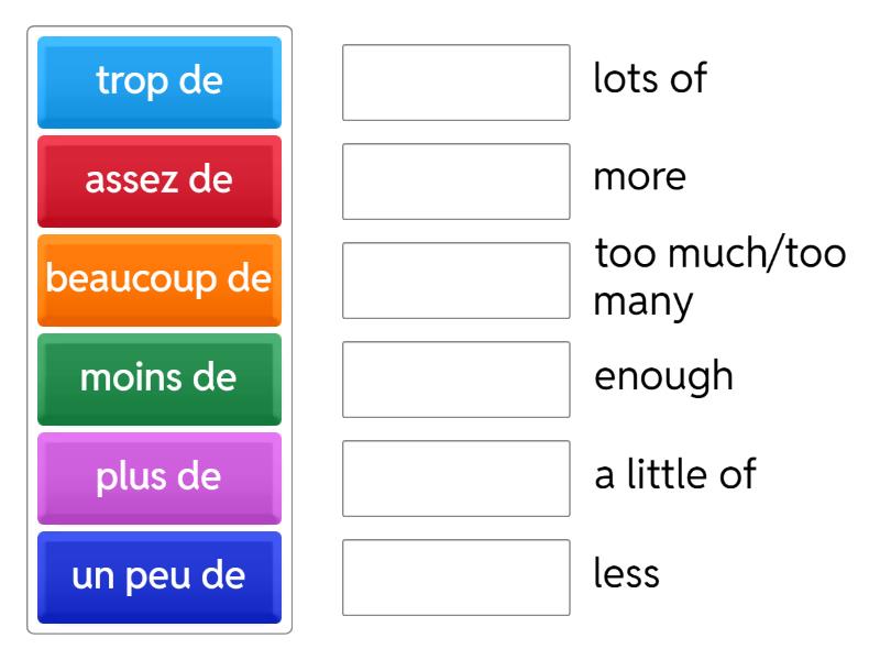 plus de    - more   , moins de    - less  , assez de    - enough  , trop de    - too much/too many  , beaucoup de    - lots of  , un peu de    - a little of,