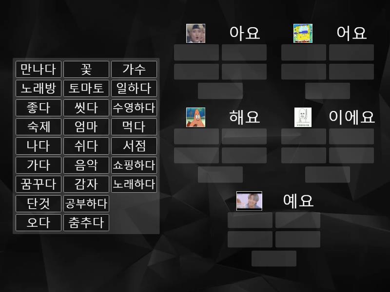 아요: 가다, 오다, 나다, 만나다, 좋다, 어요: 먹다, 씻다, 쉬다, 꿈꾸다, 춤추다, 해요: 공부하다, 수영하다, 일하다, 쇼핑하다, 노래하다, 이에요: 단것, 음악, 노래방, 서점, 꽃, 예요: 가수, 토마토, 엄마, 감자, 숙제,