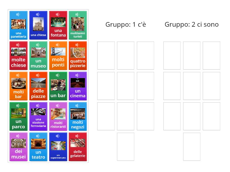 Gruppo: 1 c'è: una chiesa, un museo, un cinema, un bar, un teatro, una stazione ferroviaria, una fontana, un parco, un supermercato  , una panetteria, Gruppo: 2 ci sono: dei musei, molti negozi, molti bar, delle gelaterie, molti ristoranti, delle piazze, molte chiese, moltissimi turisti, molti ponti, quattro pizzerie,