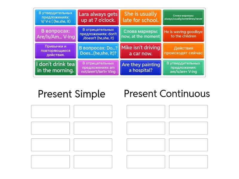 Present Simple: Привычки и повторяющиеся действия., В утвердительных предложениях: V/ V-s ( (he,she, it), В отрицательных предложениях: don't /doesn't (he,she, it), В вопросах: Do...? Does...(he,she, it)?, Слова маркеры: always/usually/sometimes/never, Lara always gets up at 7 o'clock., I don't drink tea in the morning., She is usually late for school., Present Continuous: Действия происходят сейчас, В утвердительных предложения: am/is/are+ V-ing, В отрицательных предложениях am not/aren't/isn't+ Ving, В вопросах: Are/Is/Am... V-ing, Слова маркеры: now, at the moment, He is waving goodbye to the children, Mike isn't driving a car now., Are they painting a hospital?,