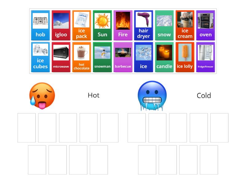 Hot: Fire, Sun, hair dryer, oven, microwave, candle, hot chocolate, barbecue, hob, Cold: snow, ice cubes, ice, ice cream, ice lolly, fridge/freezer, ice pack, igloo, snowman,