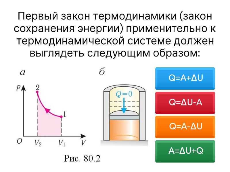 1) Первый закон термодинамики (закон сохранения энергии) применительно к термодинамической системе должен выглядеть следующим образом: a) Q=A+ΔU b) Q=ΔU-A c) Q=A-ΔU d) A=ΔU+Q 2) Наукой о тепловых явлениях называют… a) термодинамику b) биохимию c) термокинетику d) молекулярную физику 3) Состояние, при котором в системе не происходит наблюдаемых макроскопических процессов, называется: a) балансом b) термодинамическим равновесием c) термодинамическим процессом d) внутренней энергией системы 4) Физическая величина, характеризующая среднюю кинетическую энергию поступательного движения молекул газа, называется: a) температура b) температура идеального газа c) стационарное равновесие d) давление газа 5) Сумма кинетической энергии движения атомов и молекул тела и потенциальной энергии их взаимодействия называется: a) Термодинамический процесс b) Внутренняя энергия c) Общая энергия d) Энергия активации 6) Укажите авторов закона: Для газа данной массы при постоянной температуре произведение давления на объем постоянны: a) Клайперон-Менделеев b) Бойль-Мариот c) Гель-Люссак d) Харди-Вайнберг 7) Процесс передачи энергии от одного тела к другому называется: a) испарение b) теплообмен c) конвекция d) теплопродукция 8) Как называется величина, отражающая количество теплоты, которое получает или отдает вещество массой 1кг при изменении его температуры на 1К? a) теплообмен b) удельная теплоемкость c) теплоотдача d) удельная теплота парообразования 9) Какой по счету является следующий закон термодинамики: «количество энергии неизменно, она только переходит из одной формы в другую»? a) второй b) третий c) первый d) это не закон термодинамики 10) При каком термодинамическом процессе объем газа не меняет? a) изохорном b) изоферментативном c) изотермическом d) изобарном