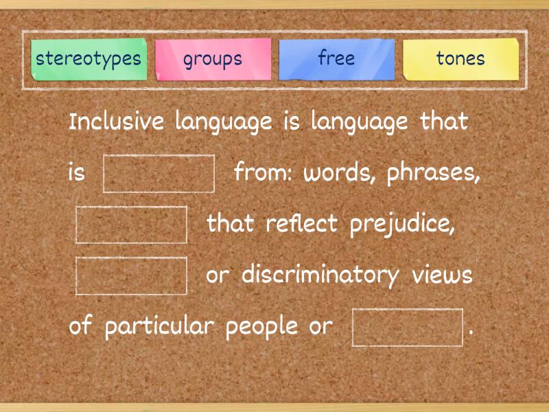 Inclusive language is language that is ____ from: words, phrases, ____ that reflect prejudice, ____ or discriminatory views of particular people or ____. It is also language that doesn't ____ or inadvertently ____ people from being seen as ____ of a ____. We must ____ that prejudice and ____ can be formed and ____ by the language that we use. Language should be used which ____ to extending ____, understanding and ____. Discrimination ____ language like other ____ of discrimination or ____ is ____ and may also be ____.