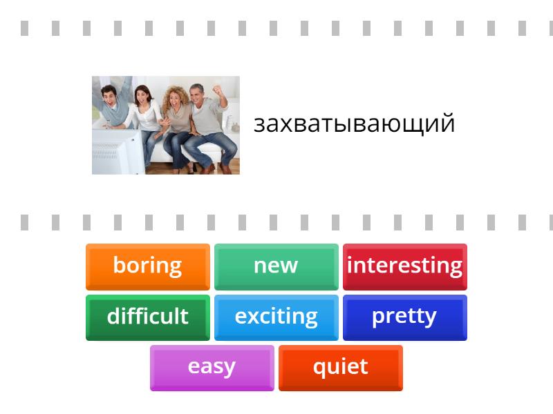 exciting - захватывающий, interesting - интересный, boring - скучный, difficult - сложный, easy - легкий, pretty - красивый, new - новый, quiet - тихий,