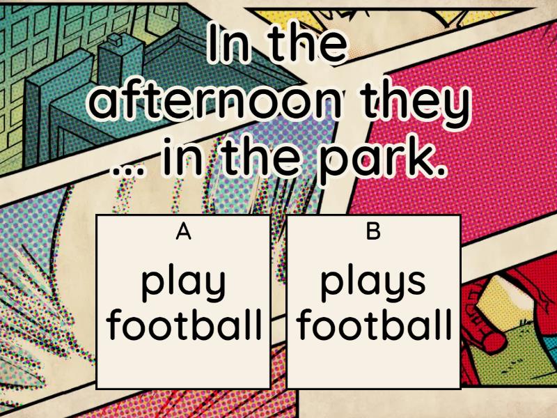 1) In the morning I .... at 5am. a) wakes up b) wake up 2) At noon we ... at school. a) have lunch b) has lunch 3) In the afternoon they ... in the park. a) play football b) plays football 4) In the morning she ... in the kitchen. a) has breakfast b) have breakfast 5) At school we ... a lot. a) study b) studies 6) At night he ... very early. a) goes to bed b) go to bed 7) My cat ... a) play with the ball. b) plays with the ball. 8) In the evening, my parents ... before going to bed. a) watch TV b) watches TV 9) At night I ... a) don't watch TV. b) doesn't watch TV. 10) At night she ... a) doesn't take a shower. b) don't take a shower. 11) In the morning he ... a) don't brush his teeth. b) doesn't brush his teeth. 12) My sister ... a) don't take the bus to school. b) doesn't take the bus to school. 13) My family and I ... before going to school. a) don't play video games b) doesn't play videogames 14) ... you wake up early? a) Do b) Does 15) ... your sister make breakfast? a) Does b) Do 16) ... your dog sleep all day? a) Do b) Does