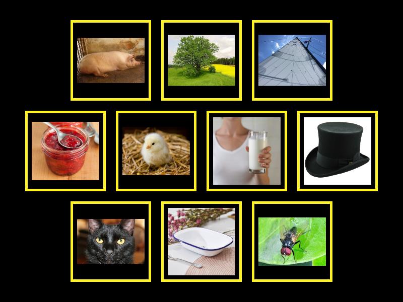 Is it a cat?, Is it a chick?, Is it a dish?, Is it a fly?, Is it a hat?, Is it jam?, Is it milk?, Is it a pig?, Is it a sail?, Is it a tree?,