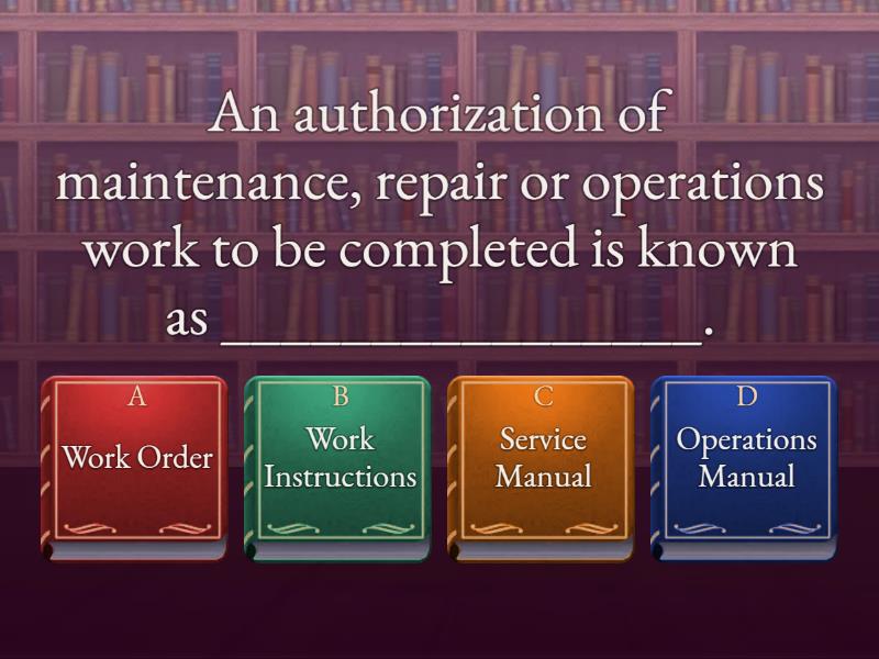 1) An authorization of maintenance, repair or operations work to be completed is known as ________________. a) Work Order b) Work Instructions c) Service Manual d) Operations Manual 2) A written step-by-step instructions that describes how to perform a routine activity is called ________________. a) Operations Manual b) Work Instructions c) Service Manual d) Work Order 3) It is a handbook containing instructions and specifications for the maintenance and repair of a material, thing or equipment a) Ergonomics Manual b) Manufacturer's Manual c) Operations Manual d) Service Manual 4) It is the documentation by which a organization provides guidance for members and employees to perform their functions correctly and reasonably efficiently. a) Ergonomics Manual b) Manufacturer's Manual c) Operations Manual d) Service Manual 5) It provides necessary information for installing, maintaining and repairing computer systems and network following the approved standard procedures. a) Hardware b) Software c) Standard Operating Procedure d) Quality Control