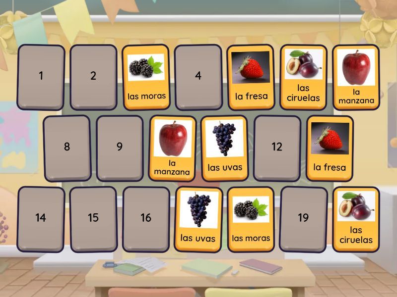 la fresa - la fresa, la manzana - la manzana, las uvas - las uvas, las ciruelas - las ciruelas, las moras - las moras, la sandia - la sandia, el aguacate - el aguacate, la piña - la piña, las peras - las peras, el coco - el coco,