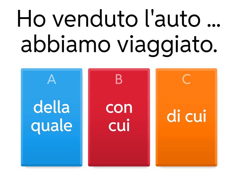 1) Questa è la ragazza ... ti ho parlato. a) la quale b) di cui c) di quale 2) Ecco la città ... sono nato. a) nella quale b) di cui c) in quale 3) Prestami la penna ... hai firmato. a) cui b) con quale c) con la quale 4) Ho venduto l'auto ... abbiamo viaggiato. a) con cui b) della quale c) di cui 5) La maestra ha mostrato le immagini ... scriveremo. a) a cui b) sulle quali c) di quali 6) Il computer ... stai lavorando è nuovo. a) con cui b) del cui c) con quale 7) Maura ha gli occhiali ... ti parlavo. a) del cui b) di quali c) di cui 8) Il pavimento ... cammini è di marmo. a) di cui b) sul quale c) sul cui 9) Questa è la canzone ... conosco le parole. a) della quale b) cui c) del quale 10) Amo la squadra ... faccio parte. a) la quale b) di cui c) di quale
