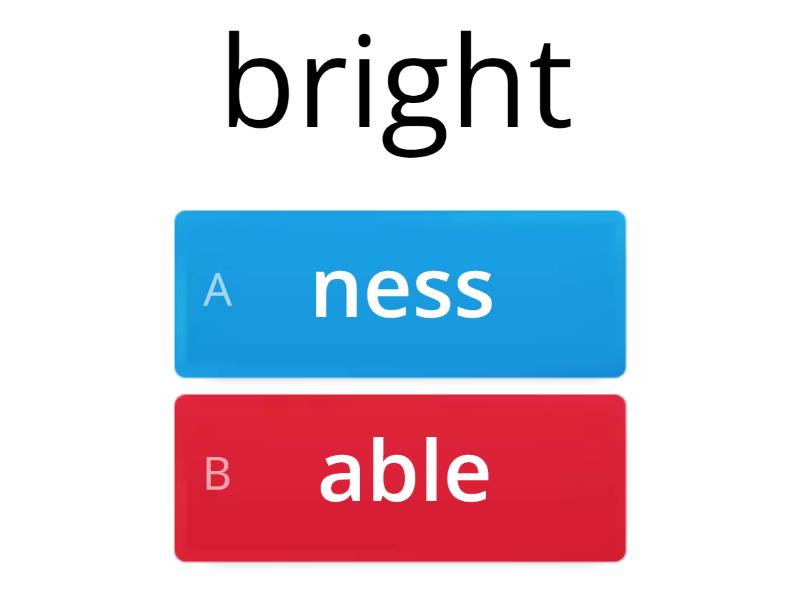 1) bright a) ness b) able 2) love a) ness b) able 3) reuse a) ness b) able 4) happy a) ness b) able 5) weak a) ness b) able 6) comfort a) ness b) able 7) break a) ness b) able 8) ill a) ness b) able 9) kind a) ness b) able 10) dispose a) ness b) able
