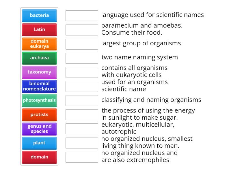 binomial nomenclature - two name naming system, taxonomy - classifying and naming organisms, plant - eukaryotic, multicellular, autotrophic, bacteria - no organized nucleus, smallest living thing known to man., archaea - no organized nucleus and are also extremophiles, domain - largest group of organisms, domain eukarya - contains all organisms with eukaryotic cells, genus and species - used for an organisms scientific name, Latin - language used for scientific names, protists - paramecium and amoebas. Consume their food., photosynthesis - the process of using the energy in sunlight to make sugar.,