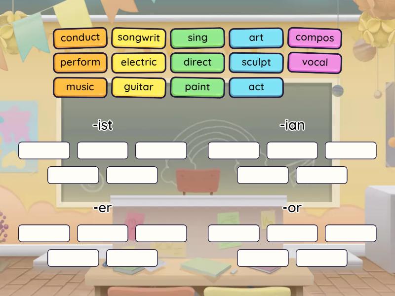 -ist: vocal, guitar, art, -ian: music, electric, -er: paint, songwrit, perform, sing, compos, -or: act, conduct, direct, sculpt,