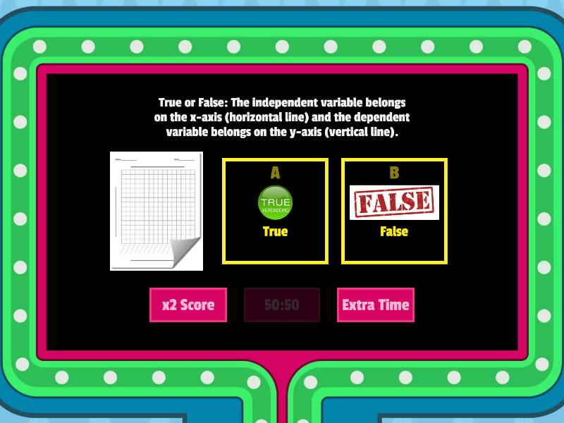 1) True or False: The independent variable belongs on the x-axis (horizontal line) and the dependent variable belongs on the y-axis (vertical line). a) True b) False 2) Why do we graph? a) Visual representation of data b) "Short hand" for presenting large amounts of information at once c) Easier to visualize trends d) More organized way of showing information e) All of the above 3) Which is NOT a type of graph? a) Bar graph b) Line graph c) Pie Chart d) Pillow Chart 4) Which variable can change? a) independent variable b) dependent variable  5) Which variable is effected by the change? a) independent variable b) dependent variable