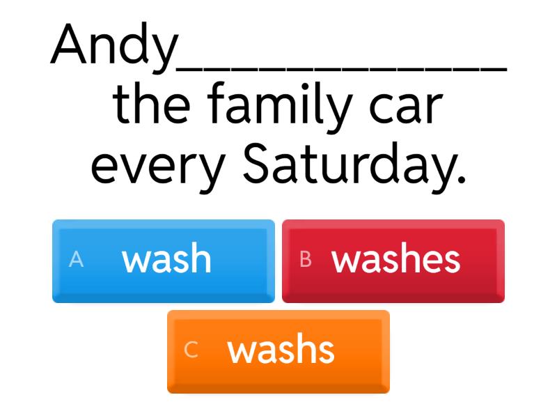 1) Andy____________ the family car every Saturday. a) wash b) washes c) washs 2) Every morning my mother _________ at 6 o'clock. a) get up b) gets ups c) gets up 3) Mr Black __________ e-mails in the evenings. a) write b) writs c) writes 4) 4) The girls _____________ the shopping twice a week. a) does b) do c) dos 5) Mandy and Susan___________ films every weekend. a) watches b) don't watch c) watching 6) John often_____________ handball. a) play b) playes c) plays 7) Carlos_____________ pizza. a) like b) likes