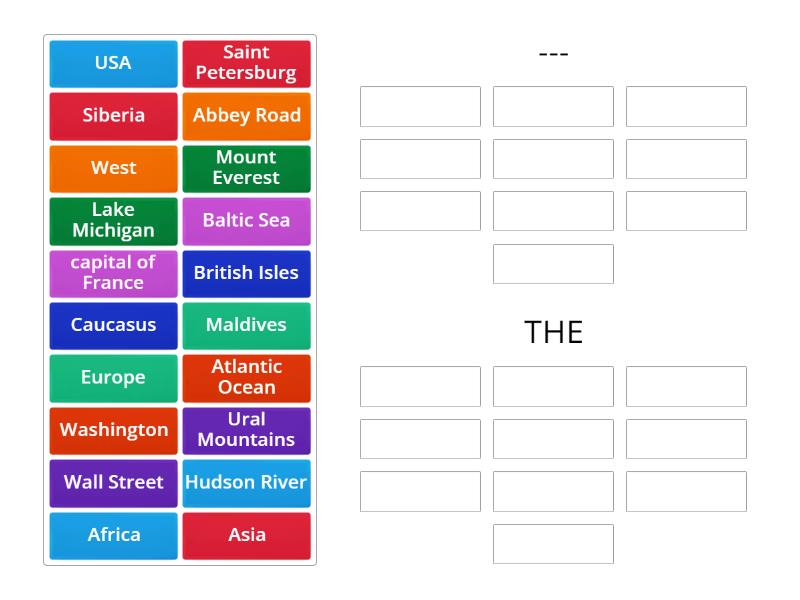 ---: Siberia, Lake Michigan, Saint Petersburg, Europe, Washington, Mount Everest, Asia, Africa, Abbey Road, Wall Street, THE: Hudson River, Ural Mountains, West, capital of France, Caucasus, Atlantic Ocean, Baltic Sea, British Isles, USA, Maldives,