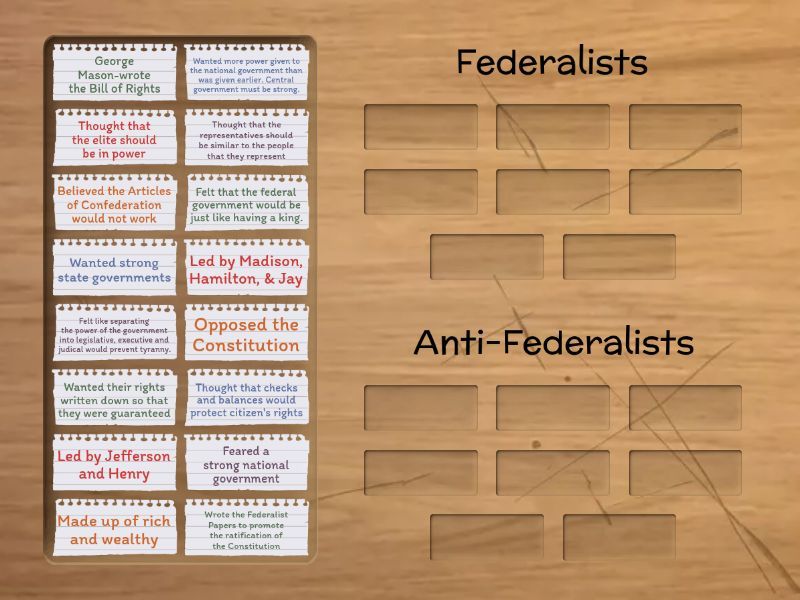 Federalists: Believed the Articles of Confederation would not work, Led by Madison, Hamilton, & Jay, Thought that the elite should be in power, Thought that checks and balances would protect citizen's rights, Wanted more power given to the national government than was given earlier. Central government must be strong. , Made up of rich and wealthy, Felt like separating the power of the government into legislative, executive and judical would prevent tyranny., Wrote the Federalist Papers to promote the ratification of the Constitution, Anti-Federalists: Opposed the Constitution, Led by Jefferson and Henry, Feared a strong national government, Wanted strong state governments, Wanted their rights written down so that they were guaranteed , Thought that the representatives should be similar to the people that they represent, George Mason-wrote the Bill of Rights, Felt that the federal government would be just like having a king. ,