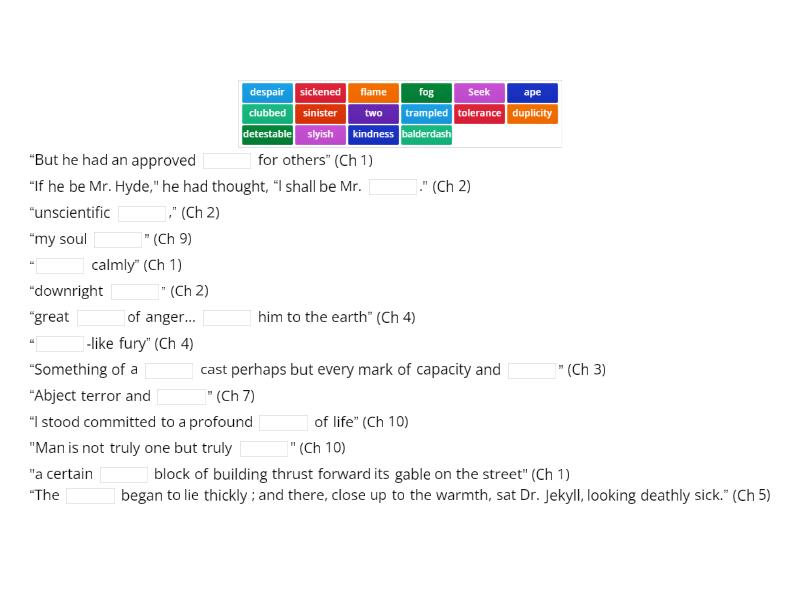 “But he had an approved ____ for others” (Ch 1) “If he be Mr. Hyde," he had thought, “I shall be Mr. ____." (Ch 2) “unscientific ____,” (Ch 2) “my soul ____” (Ch 9) “____ calmly” (Ch 1) “downright ____” (Ch 2) “great ____of anger... ____ him to the earth” (Ch 4) “____-like fury” (Ch 4) “Something of a ____ cast perhaps but every mark of capacity and ____” (Ch 3) “Abject terror and ____” (Ch 7) “I stood committed to a profound ____ of life” (Ch 10) "Man is not truly one but truly ____" (Ch 10) "a certain ____ block of building thrust forward its gable on the street" (Ch 1) “The ____ began to lie thickly ; and there, close up to the warmth, sat Dr. Jekyll, looking deathly sick.” (Ch 5)