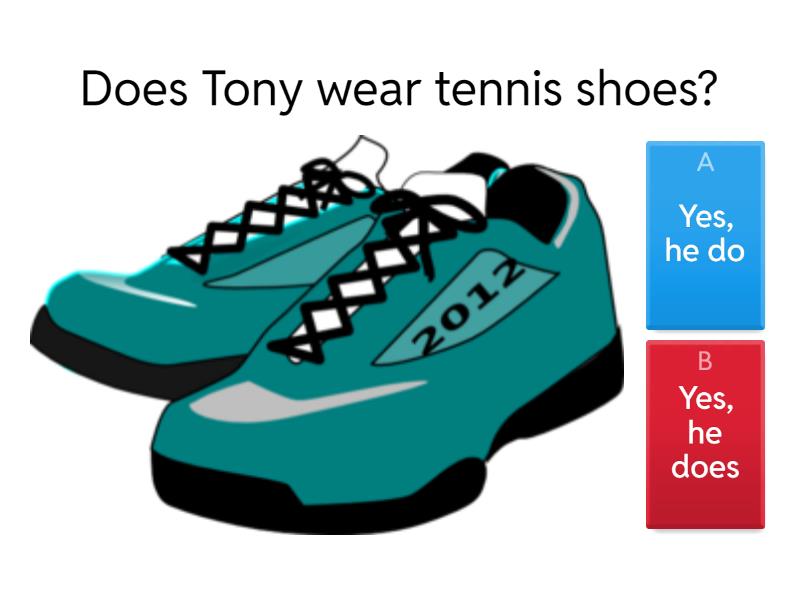 1) Does Tony wear tennis shoes? a) Yes, he do b) Yes, he does 2) Do Alex and Nick wear a leather jacket? a) No, they don't b) No, they doesn't 3) Does your mom wear high heel shoes? a) Yes, she do b) Yes, she does 4) Does Bill wear a black belt? a) No, he don't b) No, he doesn't 5) Do the boys wear blue jeans ? a) Yes, they do b) Yes, they does 6) Does your grandma round wear glasses? a) No, she don't b) No, she doesn't 7) Does Ben wear black socks? a) Yes, he do b) Yes, he does 8) Does Nick wear a withe T-shirt? a) No, he don't b) No, he doesn't 9) Do Alex and Sam wear casual trousers? a) Yes, they do b) Yes, they does 10) Do the girls wear long dresses? a) No, they don't b) No, they doesn't 11) Does Nick wear a modern watch? a) No, he don't b) No, he doesn't 12) Do you wear a purple swimsuit? a) Yes, I do b) Yes, I does 13) Does your dad wear sport shorts? a) No, he don't b) No. he doesn't 14) Does May wear a wool hat? a) Yes, she do b) Yes, she does 15) Do the children wear a colorful scarf ? a) No, they don't b) No, they doesn't 16) Does Pat wear green flip flops? a) Yes, she do b) Yes, she does 17) Do your sisters wear a fashionable hat? a) No, they don't b) No, they doesn't 18) Do Alex and Nick wear a tie ? a) Yes, they do b) Yes, they does 19) Do babies wear dippers? a) Yes, they do b) Yes, they does 20) Does the girl wear short skirts? a) No, she don't b) No, she doesn't
