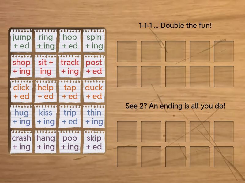1-1-1 ... Double the fun! : trip + ed , hop + ed , shop + ing , skip + ed , pop + ing , spin + ing , tap + ed , sit + ing , hug + ing , thin + ing, See 2? An ending is all you do! : ring + ing, kiss + ing , help + ed , hang + ing, duck + ed , crash + ing , click + ed , jump + ed , post + ed , track + ing,