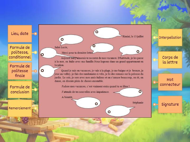 Corps de la lettre, Formule de politesse finale, Remerciement, Lieu, date, Interpellation, Signature, Formule de politesse, conditionnel, Mot connecteur, Formule de conclusion.