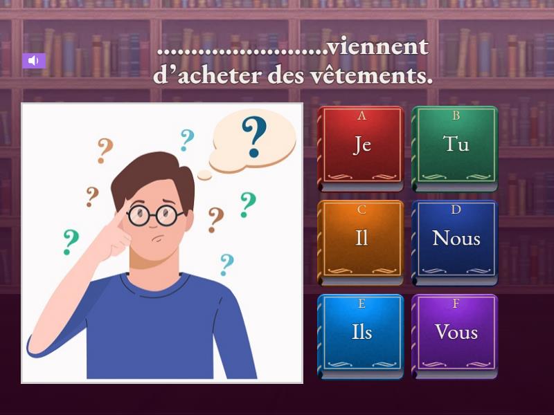 1) .........................viennent d’acheter des vêtements. a) Je b) Tu c) Il d) Nous e) Ils f) Vous 2) .........................vient de gagner le match. a) Je b) Tu c) Omar d) Nous e) Ils f) Vous 3) .........................viens d’étudier mes leçons. a) Je b) Elle c) Il d) Nous e) Ils f) Vous 4) .........................venez de ranger vos affaires. a) Je b) Elle c) Il d) Nous e) Ils f) Vous 5) Nous .........................de prendre le déjeuner avec nos parents. a) venons b) venez c) viens d) vient 6) Tu ..............de sortir de la cuisine. a) venons b) venez c) viens d) vient 7) Mona et Nada..............de faire du sport. a) venons b) venez c) viens d) vient e) viennent