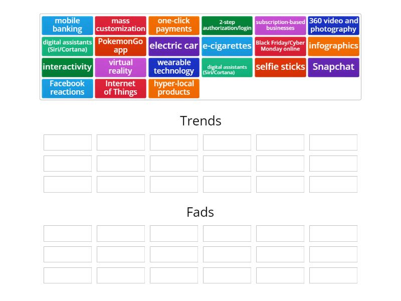 Trends: electric car, Snapchat , mobile banking , Facebook reactions, selfie sticks , digital assistants (Siri/Cortana) , virtual reality, Internet of Things , mass customization, interactivity, infographics, one-click payments, Black Friday/Cyber Monday online , e-cigarettes, 2-step authorization/login, subscription-based businesses, hyper-local products, wearable technology, Fads: 360 video and photography, PokemonGo app, digital assistants (Siri/Cortana) ,