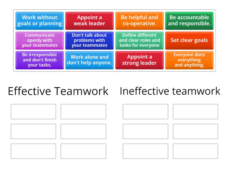 Effective Teamwork: Appoint a strong leader, Communicate openly with your teammates , Set clear goals, Define different and clear roles and tasks for everyone, Be accountable and responsible., Be helpful and co-operative., Ineffective teamwork: Appoint a weak leader, Don't talk about problems with your teammates, Work without goals or planning, Everyone does everything and anything., Be irresponsible and don't finish your tasks., Work alone and don't help anyone.,
