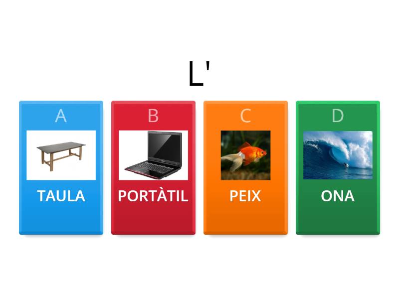 1) L' a) TAULA b) PORTÀTIL c) PEIX d) ONA 2) LA a) TAULA b) ELEFANT c) PORTÀTIL d) ONA 3) EL a) PORTÀTIL b) ELEFANT c) FINESTRA d) AURICULARS 4) LA a) FINESTRA b) AVIÓ c) ONA d) ELEFANT 5) ELS a) AURICULARS b) PORTÀTIL c) FINESTRA d) ELEFANT 6) L' a) AURICULARS b) FINESTRA c) OU d) TAULA 7) L' a) ELEFANT b) PEIX c) AURICULARS d) TAULA 8) LA a) OU b) ONA c) FORMIGA d) AURICULARS 9) EL a) AVIÓ b) ELEFANT c) TAULA d) PEIX 10) L' a) FINESTRA b) PORTÀTIL c) AVIÓ d) TAULA 11) LES a) BALLARINES b) ANIMALS c) DINOSAURE d) MOSCA 12) ELS a) AVIÓ b) ANIMALS c) MICO d) TOVALLOLES 13) EL a) TECLAT b) PEDRA c) RINOCERONT d) CARA 14) EL a) MAQUINETA b) ESTOIG c) PERA d) MICRÒFON 15) L' a) ORGUE b) DIT c) PAPER d) ORUGUES 16) ELS a) MITJÓ b) XICLETS c) RATOLÍ d) SLIME 17) LES a) COTXES b) AUTOCAR c) NENÚFAR d) FLORS 18) L' a) AIXETES b) TRINEU c) HORA d) MISTO