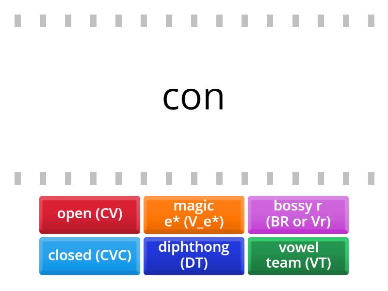 closed (CVC) - con, open (CV) - co, magic e* (V_e*) - cone, vowel team (VT) - pair, bossy r (BR or Vr) - torn, diphthong (DT) - about,